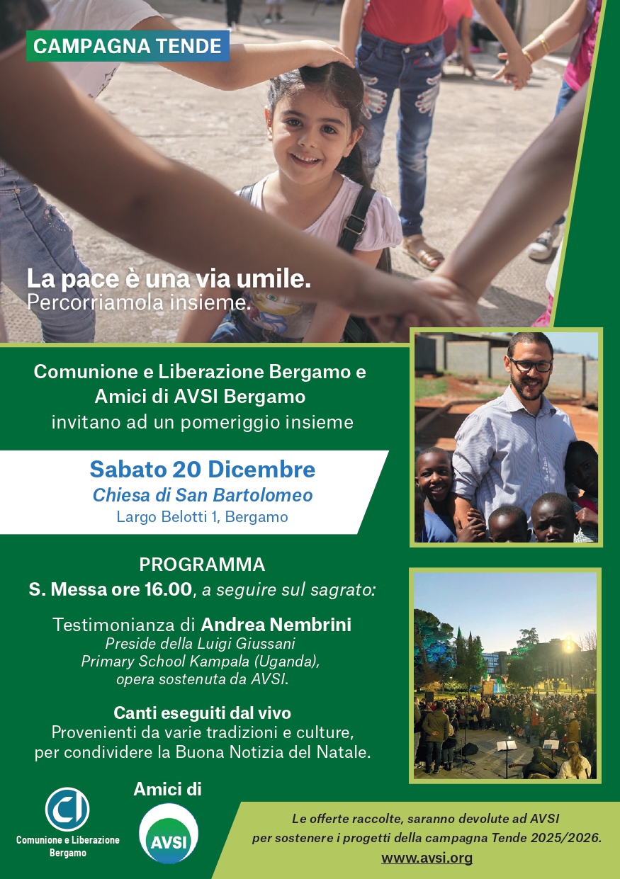 Bergamo, 17 dicembre 2025. “La pace è una via umile. Percorriamola insieme”. È il tema della Campagna Tende Avsi 2025-26, che riunisce una serie di iniziative di sensibilizzazione e raccolta fondi promosse in tutto il mondo da una rete di volontari per sostenere i progetti che Avsi ha in 41 Paesi del mondo. A Bergamo l’evento principale è promosso da Comunione e Liberazione Bergamo e dagli “Amici di AVSI” e si svolge sabato 20 dicembre nella Chiesa di San Bartolomeo a Bergamo: alle ore 16 la Santa Messa e a seguire, sul sagrato della Chiesa, la testimonianza del bergamasco Andrea Nembrini e i canti della tradizione natalizia. Andrea Nembrini, 41 anni di Trescore Balneario, è da 9 anni in Uganda ed è preside della Luigi Giussani High School di Kampala, una scuola nata dal desiderio delle donne malate di AIDS di creare un luogo dove i loro figli potessero essere educati.