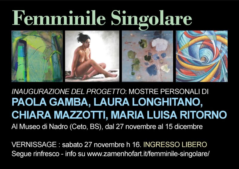 Alla Vi.P. Gallery Valcamonica si inaugura proprio sabato 11 dicembre alle h16, per la Giornata del Contemporaneo, la mostra collettiva del Progetto FEMMINILE SINGOLARE che vede in mostra 77 opere di 22 artiste contemporanee provenienti da tutta Italia: