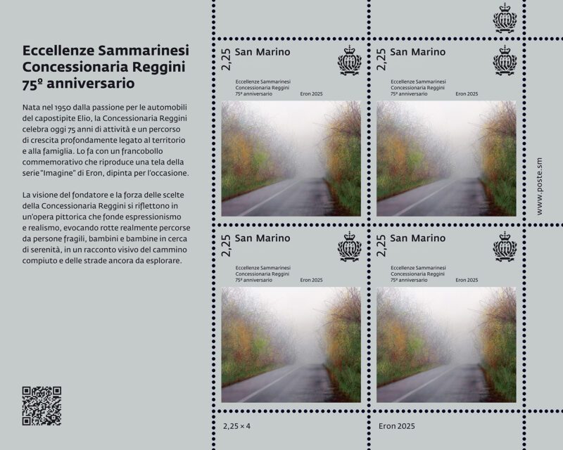 In occasione del 75° anniversario della fondazione della Concessionaria Reggini, Poste San Marino celebra questo importante traguardo con l’emissione di un francobollo commemorativo inserito nel filone “Eccellenze Sammarinesi”: un tema inaugurato nel 2024 per rendere omaggio a imprese e realtà che hanno contribuito in modo significativo allo sviluppo economico, sociale e culturale della Repubblica di San Marino.