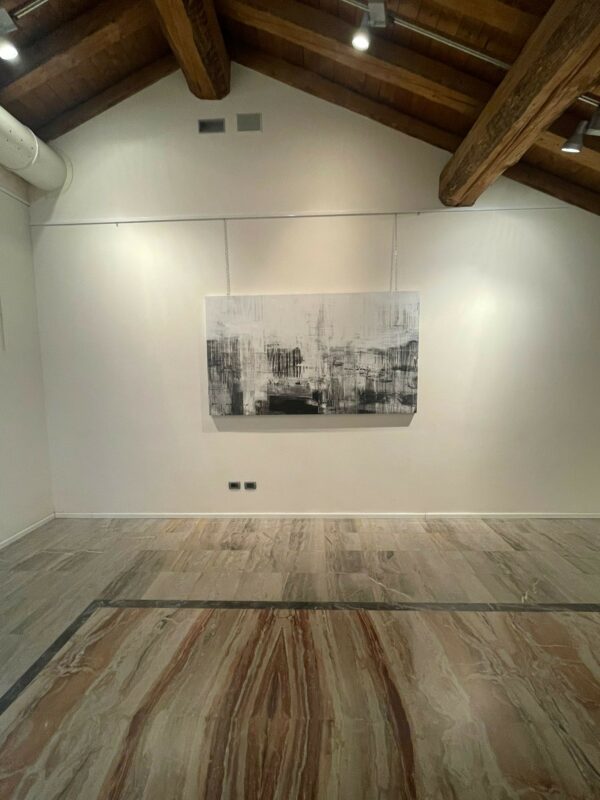 Un espressionismo fatto di luci, colori in bianco e nero per esaltare le luci e le ombre di forme sospese nel tempo. Questo quadro segna- sin dal titolo- un cambio di passo nella ricerca espressiva di Manuel Bonfanti, da “Air space” a “Light in space”. Una ricaduta a terra da uno spazio astratto tra pensiero e forma, in cerca della luce. Light in Space prende vita nel 2020, nell’anno dello scoppio della pandemia che vede Bergamo epicentro dei contagi Covid. In questo periodo si percepisce la tensione nel contrasto in bianco e nero, tra pennellate grevi e quasi violente e impalpabili tocchi e sfioramenti. La luce crea atmosfere, il gesto espressivo prende vita, inseguendo la luce e imprimendo la materia. L’arte segue i suggerimenti dell’anima in un momento di smarrimento, condensando i mesi cupi legati all’emergenza sanitaria che riporta al centro i valori essenziali e primitivi, in cui la libertà si incasella nella quotidianità, dentro le piccole cose. In questo periodo da guerra, l’arte è uno spazio d’aria in cui inserire, come in una macchina fotografica, una porzione di luce, per dare vita a istantanee legate alla creatività e percezione del momento, tra spazio interiore e ambiente, luci accecanti e ombre dense, colori spesso slavati e sfondi intensi. Fino al nuovo approdo concettuale di In The Middle of Now- Where, in cui tempo e spazio sono sospesi in un blu profondo, oceanico e fluttuante, nella gigantesca tela di venti metri quadri esposta a Venezia all’European Cultural Centre in concomitanza con la Biennale d’Arte Contemporanea. Da Bergamo a Venezia, da Venezia a Bergamo, una ricerca che corre su un filo invisibile che da sempre lega le due città, una relazione che la collettiva allo Spazio Viterbi si pone di rigenerare.