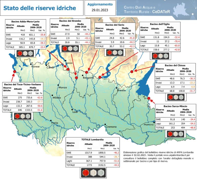 I  dati raccolti da ARPA Lombardia aggiornati al 2 febbraio sono impietosi, a livello regionale manca il 44% dell’acqua che normalmente è disponibile in questo periodo (neve + invasi idroelettrici + laghi regolati). Le riserve idriche in Lombardia sono ancora ai minimi storici. se manca l’acqua in Lombardia mancherà in tutto il distretto padano.