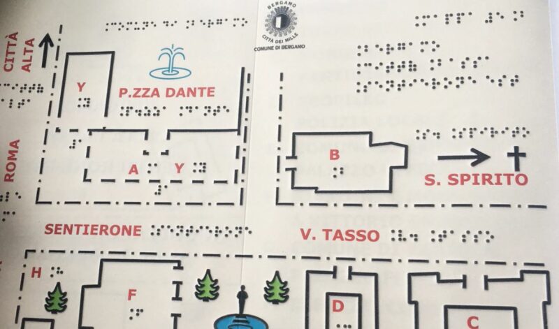 Un progetto ambizioso: ci sono voluti oltre 6 mesi di lavoro in stretta collaborazione con l’UNCI, Unione Nazionale Ciechi e Ipovedenti, per realizzare l’iniziativa. A produrre le mappe l’azienda Happy Vision, specializzata in questo tipo di soluzioni e con sede nella bergamasca. Le mappe evidenziano in braille per i non vedenti e a caratteri molto grandi per gli ipovedenti tutti i luoghi principali della città: sono otto le mappe a disposizione presso l’infopoint del Comune di Bergamo, mappe con monumenti, fontane, edifici in rilievo per agevolarne l’identificazione. Le aree di interesse vanno dal piazzale della stazione – luogo di grande rilevanza non solo per i visitatori non vedenti, ma anche per i cittadini con problemi visivi – al centro città (piazza Pontida e via XX Settembre, ma anche l’area del Centro Piacentiniano e del Teatro Donizetti) e a Bergamo Alta (con mappe che evidenziano i monumenti, ma anche i punti di interesse sulle Mura patrimonio UNESCO e un focus su piazza Duomo).