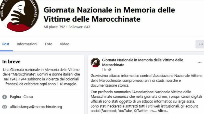 “Questo attacco informatico ha di fatto cancellato anni di studi, ricerche, raccolta di testimonianze, digitalizzazione e diffusione di materiali storici, frutto di un lavoro incessante, condotto in modo indipendente e senza alcun finanziamento pubblico o privato – prosegue l’Associazione – La natura e la gravità dell’attacco lasciano intendere un’azione mirata, volta a colpire l’associazione non solo sul piano tecnico, ma soprattutto sul piano etico e culturale, mettendo in pericolo la memoria delle vittime civili italiane, donne, uomini e bambini, che subirono violenze brutali da parte del Corpo di spedizione francese composto in gran parte da truppe coloniali magrebine durante la campagna d’Italia”.