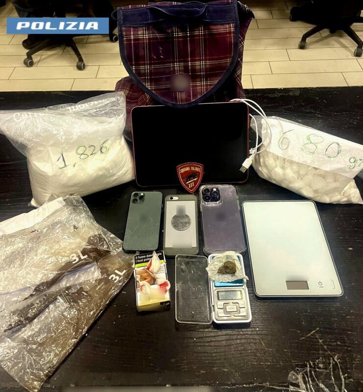 I poliziotti hanno sentito provenire dall’abitacolo un forte odore di hashish, pertanto, hanno proceduto al controllo degli occupanti e del veicolo. A seguito di perquisizione sono stati trovati in possesso del 22enne tre involucri di cocaina per un peso di circa 5 grammi e altri 5 grammi di hashish. All’interno dell’auto gli agenti hanno rinvenuto due buste trasparenti contenenti 2,520 kg di cocaina, un bilancino di precisione, 12 buste vuote di cui tre sporche di sostanza simile al caffè presumibilmente per nascondere l’odore di sostanza stupefacente.