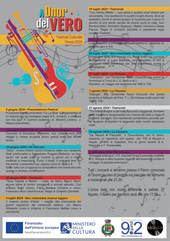 Musica pop, jazz, classica ma anche tanto teatro nella proposta di appuntamenti del Festival, curata da Diego Bergamini di MusicLab di Onore, associazione di promozione sociale nata ad Onore con lo scopo di diffondere la cultura musicale e che ha in gestione le sale prova comunale. “Siamo lieti di presentare il festival “A Onor Del Vero” che, ogni mercoledì sera da giugno a settembre, porterà nel parco comunale (o sotto i Portici del Comune in caso di pioggia) una lunga serie di concerti divisi in musica leggera, musica classica, jazz oltre a una selezione di spettacoli teatrali, di cui uno pomeridiano per bambini. I concerti e gli spettacoli saranno sempre molto intimi, e utilizzeranno il parco come naturale teatro e palcoscenico”.