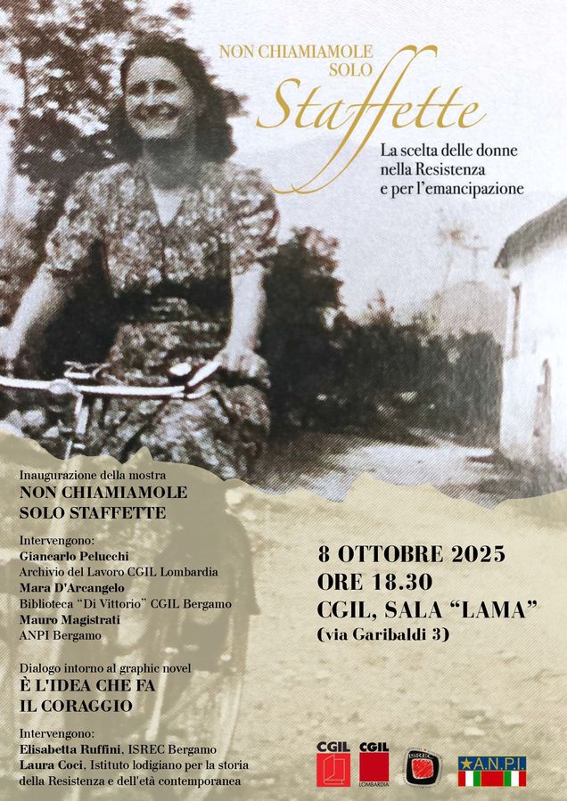 Mercoledì 8 ottobre alle 18.30, in Sala “Lama” della CGIL di Bergamo (via Garibaldi 3), si inaugura la mostra “Non chiamiamole solo staffette”, un progetto che racconta il ruolo delle donne nella Resistenza, restituendo pieno valore al loro coraggio e al loro impegno, troppo spesso ridotti a un’etichetta.