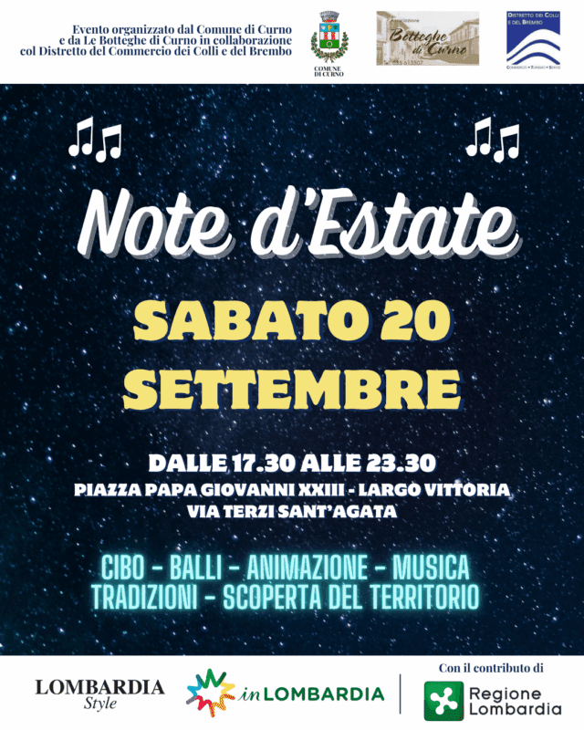 “Con Note d’Estate – le parole del Sindaco di Curno Andrea Saccogna – Curno diventa vetrina e cuore pulsante del Distretto dei Colli e del Brembo. Una serata in cui il piacere dello stare insieme si unisce alla scoperta delle nostre eccellenze e al lancio di un’infrastruttura strategica come la Ciclovia, che unisce cultura, sport, turismo e sostenibilità. Invito tutti i cittadini e i visitatori a vivere con noi questa festa speciale, resa ancora più ricca grazie al sostegno di Regione Lombardia con il bando Lombardia Style”