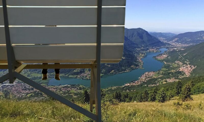 “Dalla Panchina del Doppio Lago – sottolinea Mauro Giudici – si gode di un panorama davvero incomparabile. La peculiarità del luogo di installazione è quella di consentire una visione a tutto tondo, che spazia dalle vicine Orobie (compresa la Presolana), a ValSeriana, Valcamonica e Val Cavallina. L’opportunità di sedersi su un manufatto semplice ma fuori scala, offre sensazioni davvero originali”.