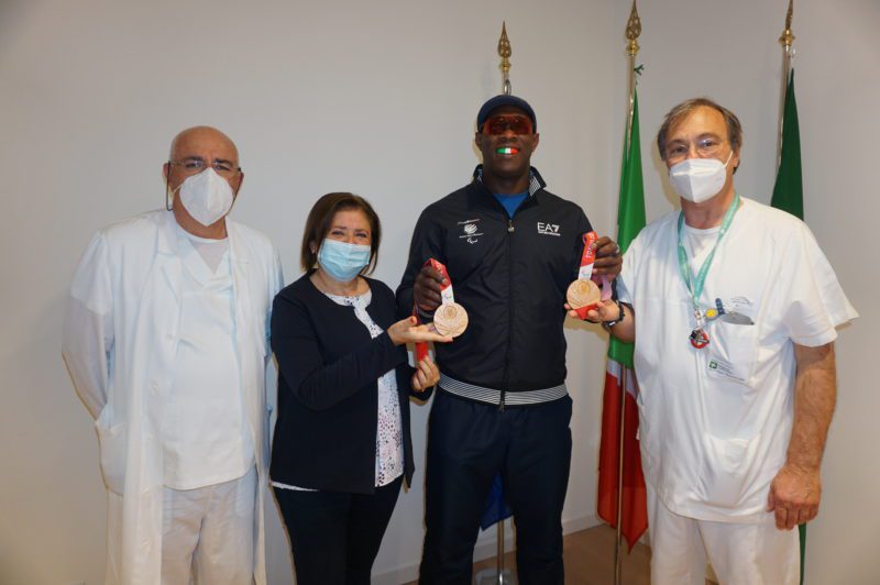 L’atleta di Sotto il Monte in provincia di Bergamo, italiano di origine cubana, ha ringraziato Federico Ristoldo, medico del Papa Giovanni e vicepresidente della SIOS (Società Italiana di Odontoiatria Sportiva), il direttore della Odontostomatologia Umberto Mariani e il loro staff per aver realizzato il ‘paradenti bite’, personalizzato con il tricolore dell’Italia proprio in previsione delle scorse Paralimpiadi. Questo dispositivo aiuta tra l’altro a compensare i disturbi temporo-mandibolari e a migliorare la coordinazione del gesto atletico.