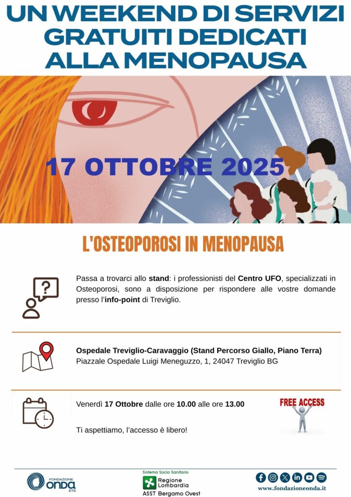 In occasione della Giornata Mondiale dell’Osteoporosi (che cade ufficialmente il 20 ottobre) e durante l’Open Week della Menopausa, venerdì 17 ottobre dalle 10.00 alle 13.00, il Centro UFO – Unità di Fragilità Ossea dell’ASST Bergamo Ovest sarà presente con un infopoint dedicato nel Percorso Giallo dell’Ospedale Treviglio-Caravaggio.