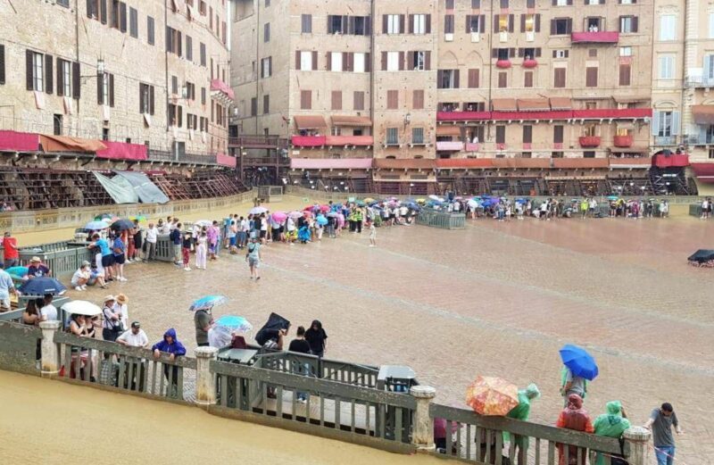 Migliaia di visitatori e turisti sono già nell’area di Piazza del Campo per l’attesissimo appuntamento ma la posizione della sindaca Nicoletta Fabio era stata netta: “La regola è che se il Corteo Storico non si potrà fare per la pioggia, sarà rinviato anche il Palio”.