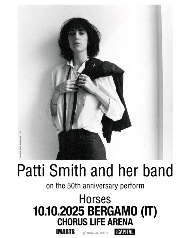 A cinquant’anni dall’uscita di Horses, Patti Smith celebra la longevità e l’influenza delle canzoni contenute nell’iconico disco con una serie di concerti speciali in tutto il mondo con il tour “Horses 50th anniversary” che toccherà anche l’Italia per una sola data il 10 ottobre 2025 a Bergamo, ChorusLife Arena.