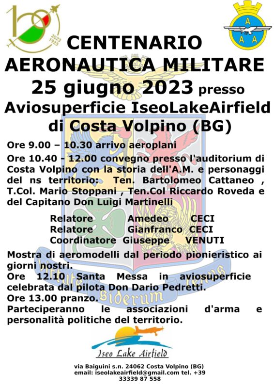 Una giornata intensa, quella di domenica 25 luglio a Costa Volpino per festeggiare i 100 anni dell’istituzione dell’aviazione militare.La giornata si svilupperà presso l’area della pista in riva al lago anche se un momento celebrativo si svolgerà presso l’auditorium di via Nazionale dove dietro il coordinamento di Giuseppe Venuti e gli interventi di Amedeo e Gianfranco Ceci si ripercorrerà l’entusiasmante storia dell’aviazione italana e si ricorderanno i perosnaggi del territorio che hanno contribuito, attraverso le loro gesta, a far crescerere l’interesse per il volo: il tenente Bartolomeo Cattaneo, il tenente colonnello Mario Stoppani, il tenente colonnello Riccardo Roveda e il capitano don Luigi Martinelli .