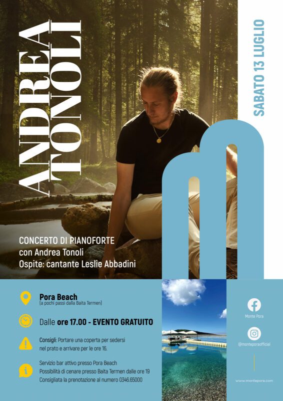 Il concerto, che vedrà esibirsi il rinomato pianista bergamasco Andrea Tonoli per la prima volta al Pora Beach, avrà luogo il prossimo 13 luglio alle 17:00. “Ogni anno riceviamo numerose proposte riguardanti concerti nelle nostre splendide vallate. Quest’anno tuttavia abbiamo voluto, in collaborazione con IRTA Spa, alzare ancora una volta l’asticella. Così è nata l’idea di questo grande concerto su una piattaforma galleggiante nel mezzo del laghetto che troviamo in cima al Monte Pora: un modo, inoltre, per festeggiare insieme alle nostre comunità ed a tutti coloro che parteciperanno, questi primi 10 anni di carriera.” ha commentato Andrea Tonoli. Alcuni brani saranno eseguiti in collaborazione con la cantante bergamasca Leslie Abbadini.