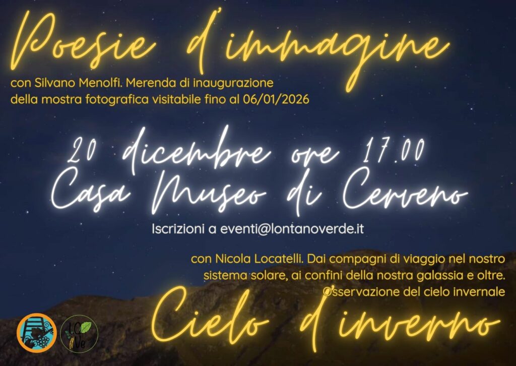 L’Associazione Lontàno Verde vi invita al doppio evento POESIE D’IMMAGINE E CIELO D’INVERNO che si terrà sabato 20 dicembre presso la Casa Museo di Cerveno. Silvano Menolfi, membro del circolo fotografico Civitas di Cividate Camuno e Nicola Locatelli, appassionato astrofilo, vi aspettano per un evento corale per salutare insieme l’arrivo dell’inverno accompagnati dalla magia delle immagini, delle parole e del cielo.