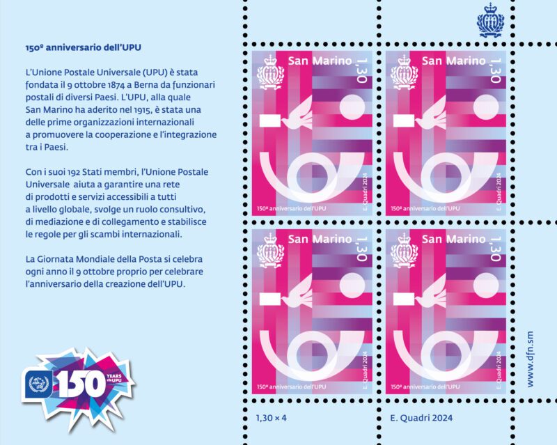Poste San Marino festeggia l’Unione Postale Universale (UPU) con un francobollo da euro 1,30 che verrà emesso il 9 ottobre 2024 in 20.000 esemplari.