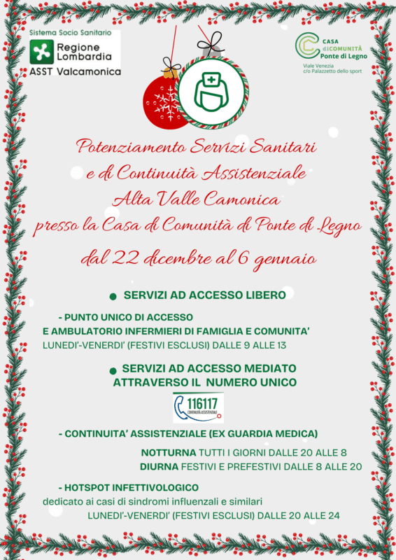 In previsione dell’aumento dell’afflusso turistico durante leprossime festività natalizie, dal 22 dicembre al 06 gennaio ASSTdella Valcamonica potenzia i servizi sanitari e di ContinuitàAssistenziale in Alta Valle.Presso la Casa di Comunità di Ponte di Legno (Viale Venezia c/oPalazzetto dello Sport) saranno previsti:➢ PUNTO UNICO DI ACCESSO E AMBULATORIO INFERMIERIDI FAMIGLIA E COMUNITA’Saranno aperti il Punto Unico di Accesso e l’ambulatorioinfermieristico IFeC, rivolto a residenti, turisti italiani/stranieri e lavoratori stagionali chenecessitano di prestazioni sanitarie di I°livello. Accedendo all’ambulatorio gli utenti potrannoessere accolti e valutati dagli Infermieri per prestazioni quali rilevazione parametri vitali,inquadramento episodi traumatici, valutazione ferite.- dal lunedì al venerdì (esclusi i festivi)- dalle ore 9.00 alle ore 13.00- accesso libero➢ POTENZIAMENTO DELLA CONTINUITA’ ASSISTENZIALESarà potenziato il Servizio di Continuità Assistenziale feriale notturno e festivo H24.- tutti i giorni dalle ore 20:00 alle ore 8:00- giorni festivi e prefestivi h 24- per accedere è necessario chiamare il numero unico europeo 116117➢ HOTSPOT INFETTIVOLOGICO (ambulatorio per persone con sindromi influenzali)La persona (dai 6 anni in su) che presenta sintomatologia respiratoria da sindrome influenzale osimilari potrà essere indirizzato all’Hotspot Infettivologico, attivo dal lunedì al venerdì, esclusi ifestivi, dalle ore 20:00 alle ore 24:00, contattando il numero unico 116117, che fornirà a breve unappuntamento per la visita.- dal lunedì al venerdì (esclusi i festivi)- dalle ore 20:00 alle ore 24:00- per accedere è necessario chiamare il numero unico europeo 116117Nello stesso periodo, inoltre, presso gli Ospedali di Edolo ed Esine è previsto unpotenziamento del personale nei Pronto Soccorso, tenendo conto del possibile incremento diaccessi legato all’aumento del flusso turistico, particolarmente intenso durante le festività natalizie.