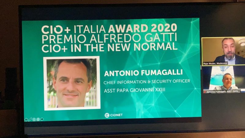 Come nelle precedenti edizioni è stato conferito il premio speciale Alfredo Gatti in memoria del Fondatore di CIONET Italia alla categoria CIO+ in the New Normal, al Leader IT espressione della resilienza in un anno particolare come quest’ultimo. Il premio è stato assegnato ad Antonio Fumagalli, Chief Information & Security Officer della ASST Papa Giovanni XXIII che dichiara: “Negli ultimi mesi la pandemia ha stravolto la nostra vita portando a cambiamenti ed azioni rapidissime che, in altre circostanze, probabilmente avrebbero richiesto anni per accadere o essere semplicemente approvate. Il progetto realizzato è frutto di una storia umana emozionante ed indimenticabile, indirizzata ad una grande causa al confronto della quale ogni altra attività professionale passa in secondo piano. Il premio è dedicato a tutti coloro che hanno contribuito con passione, energia, idee e intelligenza fuori dal comune facendo l’impossibile per mettere i colleghi sanitari nelle migliori condizioni tecnologiche e operative per curare i malati.”