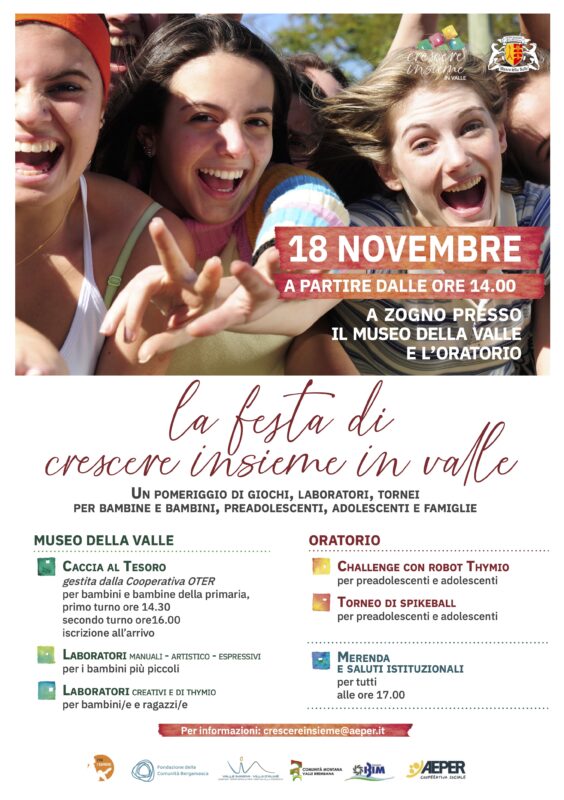 Il progetto ‘CRESCERE INSIEME IN VALLE’ è un progetto che, nel 2019, è stato selezionato da Impresa Sociali Con i Bambini nell’ambito del Fondo per il contrasto della povertà educativa minorile. Per quattro anni, il progetto ha previsto la realizzazione di un’articolata serie di azioni destinate alle fasce d’età comprese tra gli 0 e i 17 anni, sui territori delle Valli Brembana e Imagna.