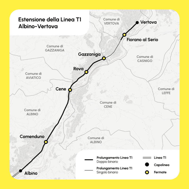 Il tracciato dell’estensione della Linea T1, della lunghezza di 7,3 Km, si sviluppa quasi parallelamente alla strada statale SS671 della Valle Seriana. Conta sette fermate: Albino (corrispondente all’attuale capolinea della Linea T1), Comenduno, Cene, Rova, Gazzaniga, Fiorano al Serio e Vertova ed attraversa i comuni di Albino, Gazzaniga, Fiorano al Serio e Vertova, lambendo il territorio di Cene senza attraversarlo direttamente. Questa configurazione permette di servire efficacemente i principali centri abitati, mantenendo un equilibrio tra accessibilità e riduzione dell’impatto sulle aree residenziali e naturali.