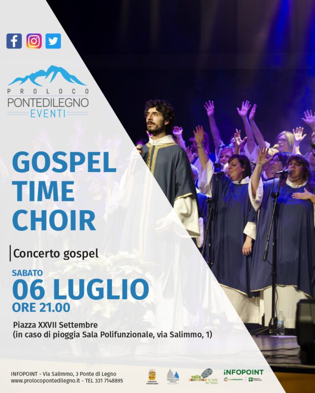Gospel time choir, un fantastico concerto Gospel in Piazza XXVII Settembre a Ponte Di Legno sabato 6 Luglio dalle ore 21.00 alle ore 23.00, in caso di pioggia si svolgerà in sala polifunzionale, in via Salimmo 1. Ingresso libero senza prenotazione, concerto da non perdere.