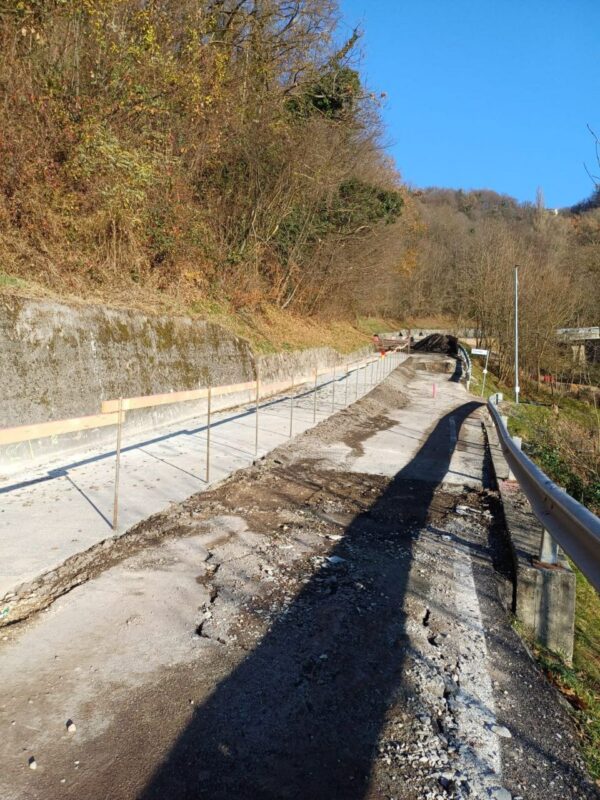 Si è provveduto alla realizzazione di una corsia provvisoria per consentire il transito a senso unico alternato regolato da semaforo in attesa del consolidamento dell’intera sede stradale.