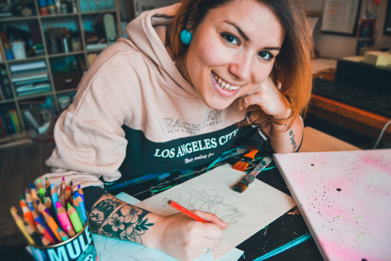 Finita la terza media, s’iscrive al liceo scientifico. Il più comodo, il più vicino visto che scendeva da Cimbergo. Ma non fa per lei, non le piace, non sono le sue materie. Perde un anno, che poi non è un anno perso visto che le ha permesso di trovarsi. Passa all’artistico, anteponendo la propria passione alla comodità o alla distanza. Dopo la maturità entra in Accademia Santa Giulia, a Brescia, dove studia pittura. Viene formata per una professione che non esiste, con una laurea in mano e i pennelli in borsa, decide di costruirsi la propria strada. Così fonda Octofly Art, un progetto indipendente nato dal desiderio di esprimere una forma diversa di arte che coniughi cartoon e street art, disegni sulla tavoletta e altri con l’Uniposca.