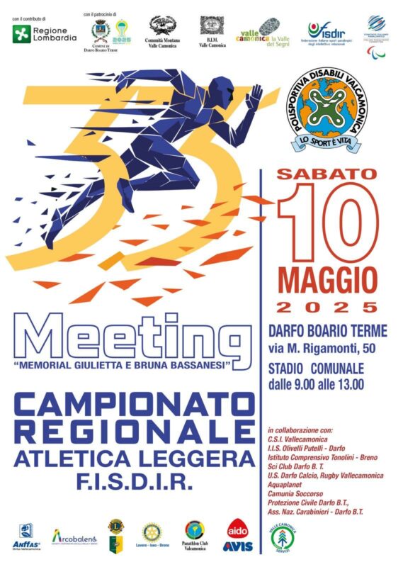 Anche quest’anno la Polisportiva Disabili Valcamonica propone il Meeting di Atletica Leggera, giunto alla 33esima edizione e valido come Campionato regionale FISDIR dedicato alla memoria di Giulietta e Bruna Bassanesi: la manifestazione sportiva si svolgerà sabato 10 maggio a partire dalle ore 9,00 presso lo Stadio Comunale di Darfo Boario Terme.
