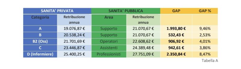 Di seguito, un raffronto degli stipendi annui in sanità pubblica e privata (stipendio base tabellare lordo + indennità fisse, escluse invece quelle variabili).