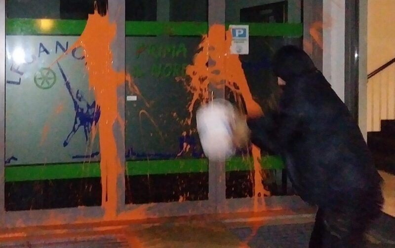 «Abbiamo deciso questa sera di sanzionare la sede del partito di Matteo Salvini, la Lega». E’ quanto riportato sulla pagina Facebook di Kascina Autogestita Popolare che rivendica così l’imbratto di vernice arancione alla sede della Lega di Bergamo.