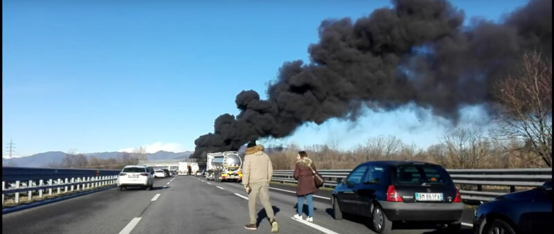 Subito dopo lo scontro uno dei due camion ha preso fuoco insieme ad un’autocisterna. Altissima la colonna di fumo che era visibile anche a chilometri di distanza. Circolazione interrotta e traffico paralizzato.