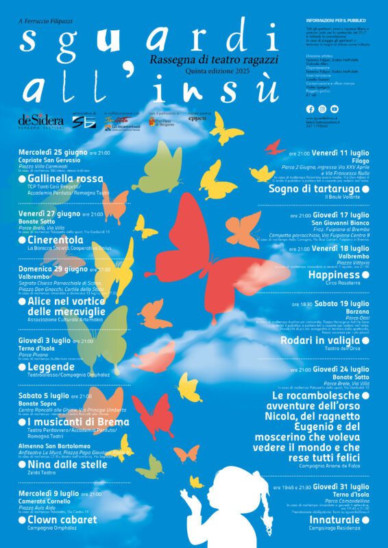 Sono passati 5 anni dalla prima edizione di Sguardi all’Insù. Nato nel 2020, su invito del Sistema bibliotecario di Ponte San Pietro che voleva dare il via a una rassegna estiva dedicata al teatro per le nuove generazioni. Nasce così “Sguasrdi all’insù”, una rassegna che dal 2020 porta nei paesi aderenti del Sistema Bibliotecario di Ponte San Pietro magia, storie e tanto stupore.