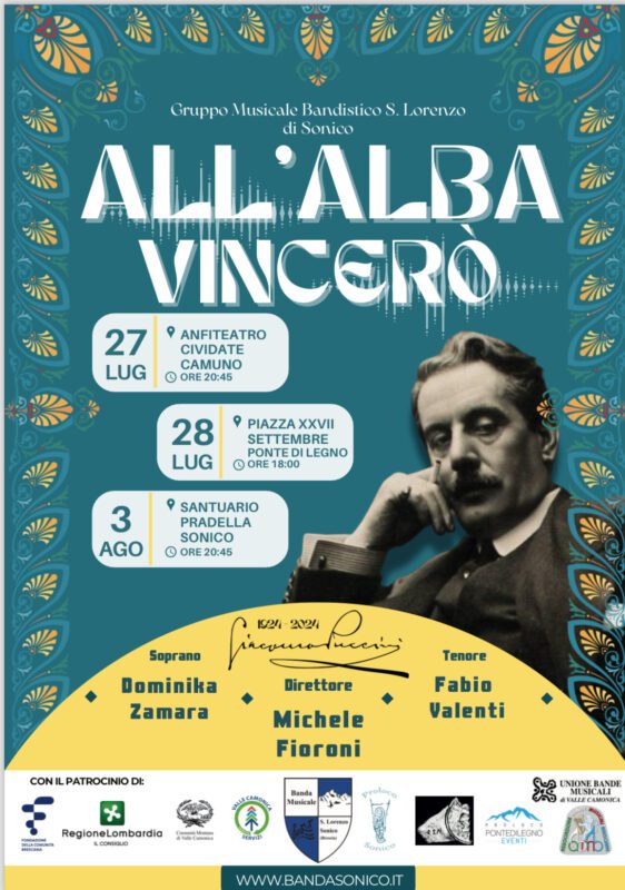 Per celebrare i 100 anni dalla morte di Giacomo Puccini, il Gruppo Musicale Bandistico S. Lorenzo di Sonico è lieto di invitarvi all’evento “All’alba vincerò”. Un concerto dedicato a un genio della musica italiana amato e conosciuto in tutto il mondo; durante le serate insieme a un Soprano e a un Tenore d’eccezione, il Gruppo proporrà al pubblico alcune delle più celebri arie pucciniane.