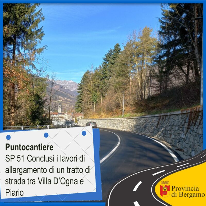 Punto cantiere: conclusi i lavori di allargamento di un tratto di strada della SP 51 tra Villa D’Ogna e Piario. La strada è stata allargata per avere una piattaforma con una larghezza di m 6.50, costituita da due corsie di m 3,00 affiancata da cunetta in cls per la raccolta delle acque meteoriche sul lato di monte della larghezza di m 0,50.