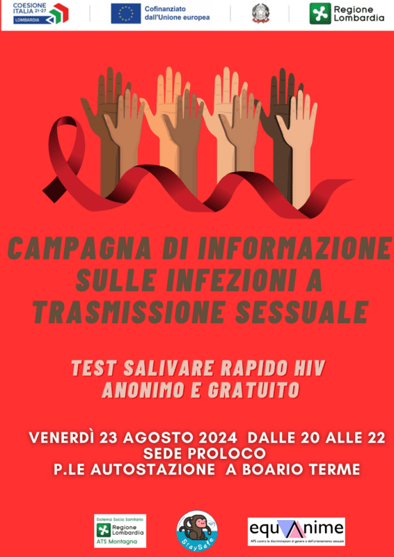 Venerdì 23 agosto dalle 20 alle 22 sarà possibile eseguire il test salivare rapido per l’HIV, in modo anonimo e gratuito. L’appuntamento è nella sede della Proloco di Boario Terme, piazzale Autostazione. Oltre al test verrà fornita anche una consulenza, sempre gratuita, sulla prevenzione delle malattie a trasmissione sessuale. L’iniziativa è organizzata da ATS Montagna, Cooperativa di Bessimo Onlus nell’ambito del Progetto Stay Safe e Associazione di promozione sociale Equanime, contro le discriminazioni di genere e dell’orientamento sessuale.