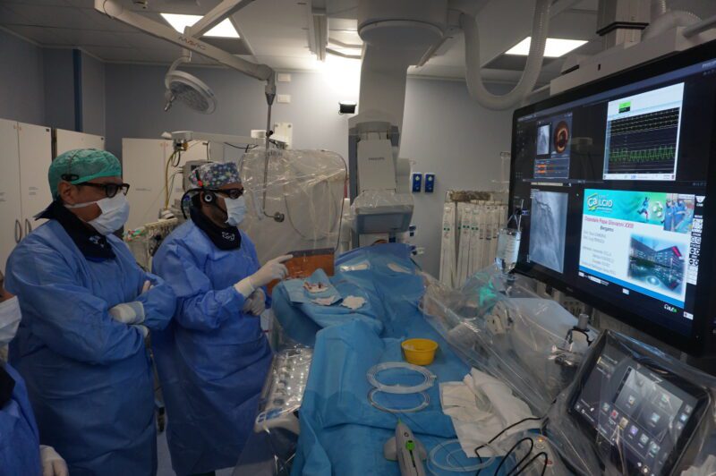 È la seconda diretta dalle sale di emodinamica dell’Ospedale di Bergamo nel giro di pochi giorni. I presenti in sala al recente Congresso della Società Italia di Cardiologia Interventistica – GISE di fine novembre a Milano hanno potuto assistere ad un “live case” in videocollegamento dall’Ospedale di Bergamo, tra gli otto centri italiani selezionati per le sessioni in diretta delle mattinate congressuali, su un totale di oltre 250 che compongono la rete italiana dell’emodinamica. L’intervento di angioplastica coronarica trasmesso al Congresso, effettuato da Paolo Canova e Francesco Moretti ha riguardato il trattamento di un paziente di 60 anni con malattia coronarica diffusa in cui, grazie sempre all’impiego di OCT, non sono stati volutamente impiantati stent ma si è dilatato la coronaria malata con dei palloni medicati, che consentono il lento rilascio nelle coronarie di un farmaco che cura la placca aterosclerotica.