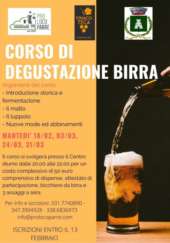 Un corso di degustazione di birra: è quello proposto dalla Pro Loco di Parre in collaborazione con la vinacoteca “Il gusto del vino” di Clusone ed il patrocinio del Comune di Parre. Il corso, che partirà martedì 18 febbraio, prevede quattro lezioni su altrettanti diversi temi e si svolgerà presso il Centro Diurno (Via Duca D’Aosta) a Parre, dalle 20.00 alle 22.00.