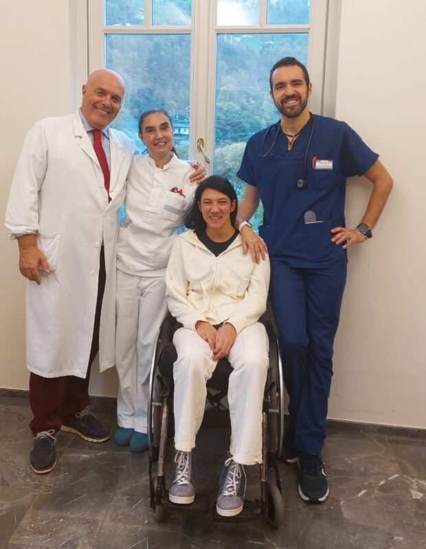 Kafka scriveva che “un libro deve essere un’ascia per rompere il mare ghiacciato che è dentro di noi”. Ed è quello che è riuscito a fare Valentina Bottini (in foto con, da sx: il dottor Giampietro Salvi, l’infermiera Paola Bettineli e il fisiatra Massimo Piga), 37 anni di Busto Arsizio, con il suo libro “Anche io salto i crepacci – Storia ed esercizi di un bruco diventato farfalla” che racconta, non senza un po’ di ironia, le sedute di fisioterapia con Mattia (che ha collaborato alla realizzazione del libro), i successi e le difficoltà, presso l’Istituto Clinico Quarenghi di San Pellegrino Terme nel 2021.