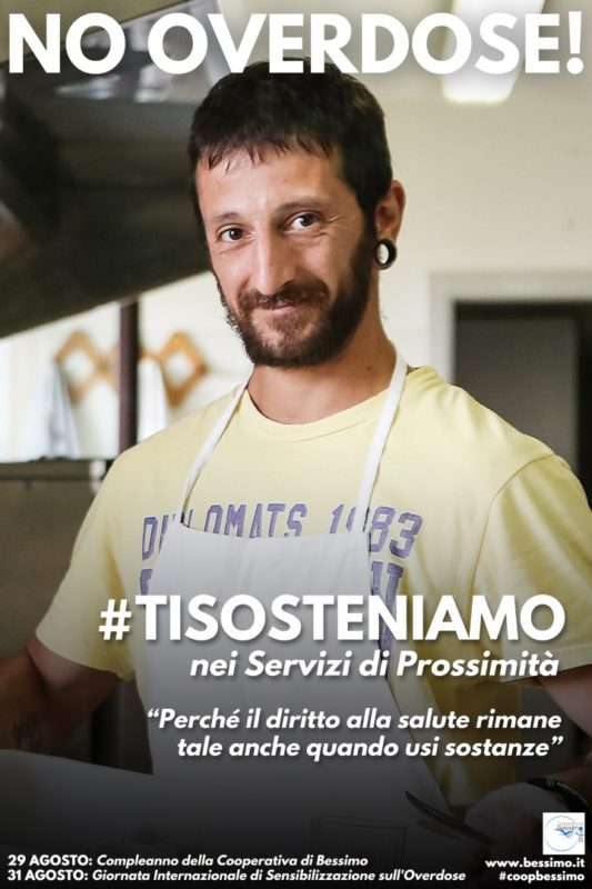 Il 31 agosto si celebra invece la Giornata internazionale di sensibilizzazione sull’overdose, un tema che è da sempre al centro di tutto ciò che viene fatto ogni giorno attraverso l’impegno di tutta la nostra rete di servizi. “Vi presentiamo la campagna di comunicazione, con l’hashtag #TISOSTENIAMO, che abbiamo realizzato per riflettere sul fatto che ogni nostra attività è votata alla protezione dall’Overdose: i servizi Residenziali, i servizi di Prossimità (Unità Mobili, Dropin, Tutor Condominiali, Servizio Prevenzione) che operano in strada e nei contesti di rischio e/o marginalità, l’Housing Sociale e gli Agenti di rete che operano nelle carceri, ma anche – aspetto che spesso passa in secondo piano – l’Area Amministrativa, l’Area Comunicazione, il Settore Risorse Umane, la Segreteria, il Sistema Qualità, l’Area Sviluppo, l’Area Progettazione Sociale che lavorano nel «dietro le quinte» ma che partecipano TUTTI
