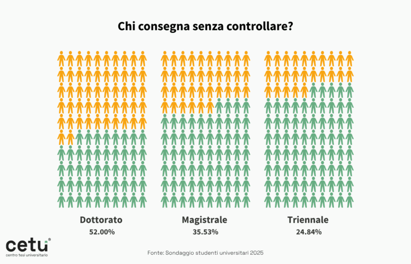 Il 29% degli studenti ammette di aver consegnato almeno un elaborato interamente redatto dall’IA, senza alcuna revisione. “Un caso su dieci di lavori generati integralmente e quasi uno su tre senza rilettura – sottolinea Pierpaolo Alfani, Operation Manager di Team CETU – incide direttamente sull’integrità accademica. È necessario definire policy chiare, criteri di valutazione coerenti e competenze digitali condivise lungo tutta la filiera formativa”.