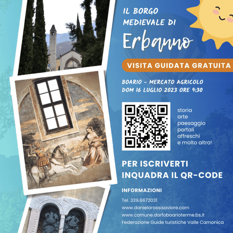 La prossima visita guidata è in programma per domenica 16 luglio 2023, nel borgo medievale di Erbanno, con Daniela Rossi Saviore. La partecipazione è gratuita, previa iscrizione, a cui seguirà email con i dettagli.